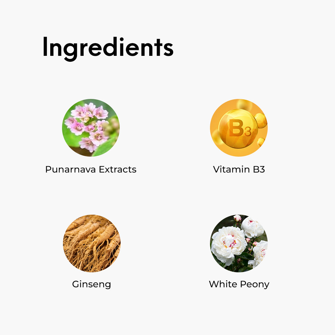 Together, this powerful quartet of Vitamin B3, Ginseng, White Peony, and Punarnava Extracts forms a symphony of skincare excellence, addressing various skin concerns and contributing to the overall goal of achieving brighter, clearer, and energized skin.