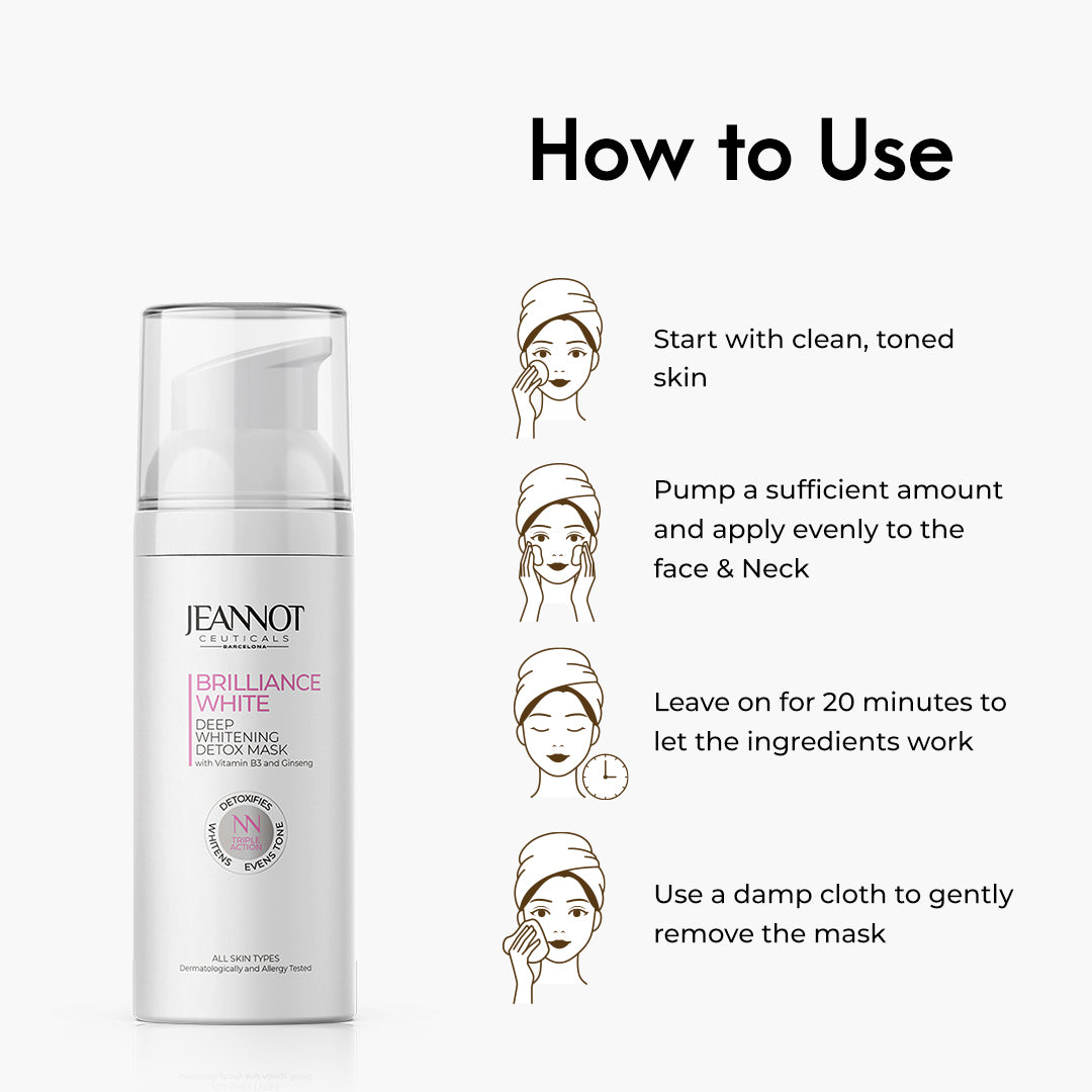 Experience Instant Radiance with Jeannot Ceuticals' Brilliance White Detox Mask. Elevate your skincare routine with the enchanting glow bestowed by Jeannot Ceuticals’ Skin Whitening Face Mask from the Brilliance White Range. Crafted with precision and infused with the potent combination of Vitamin B3 and Punarnava extract, this whitening marvel is your ticket to immediate illumination and a lit-from-within radiance.