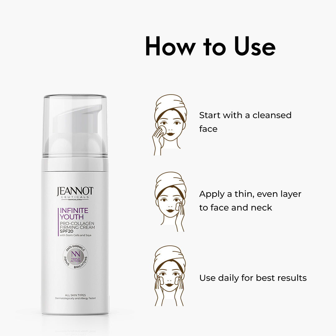 Embrace the transformative synergy of plant stem cells and soy extracts in Jeannot Ceuticals' Pro-Collagen Firming Cream SPF 20—an exquisite blend that nurtures, rejuvenates, and unveils the inherent beauty of your skin.